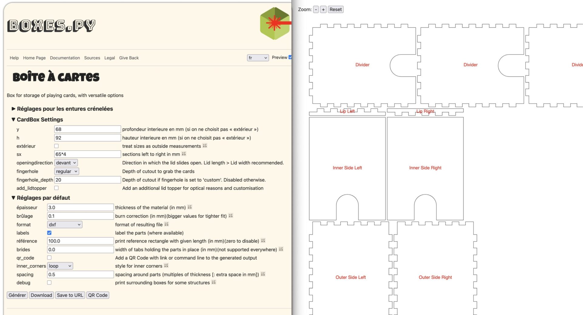 • Entrées utilisateur : Longueur, largeur et hauteur du paquet de cartes, épaisseur du matériau (ex: contreplaqué de 3mm, acrylique) et jeu d’assemblage (tolérance).